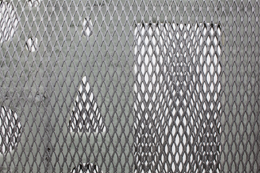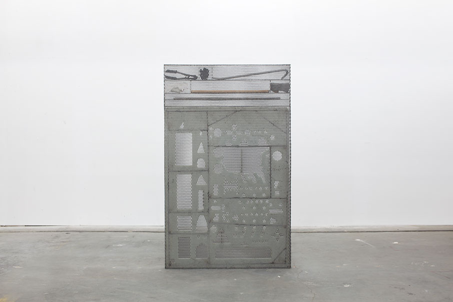 Expanded steel, cast glass spheres, crowbar, rebar, axe, plaster hand, bolt cutters, coal slag, urethane, steel