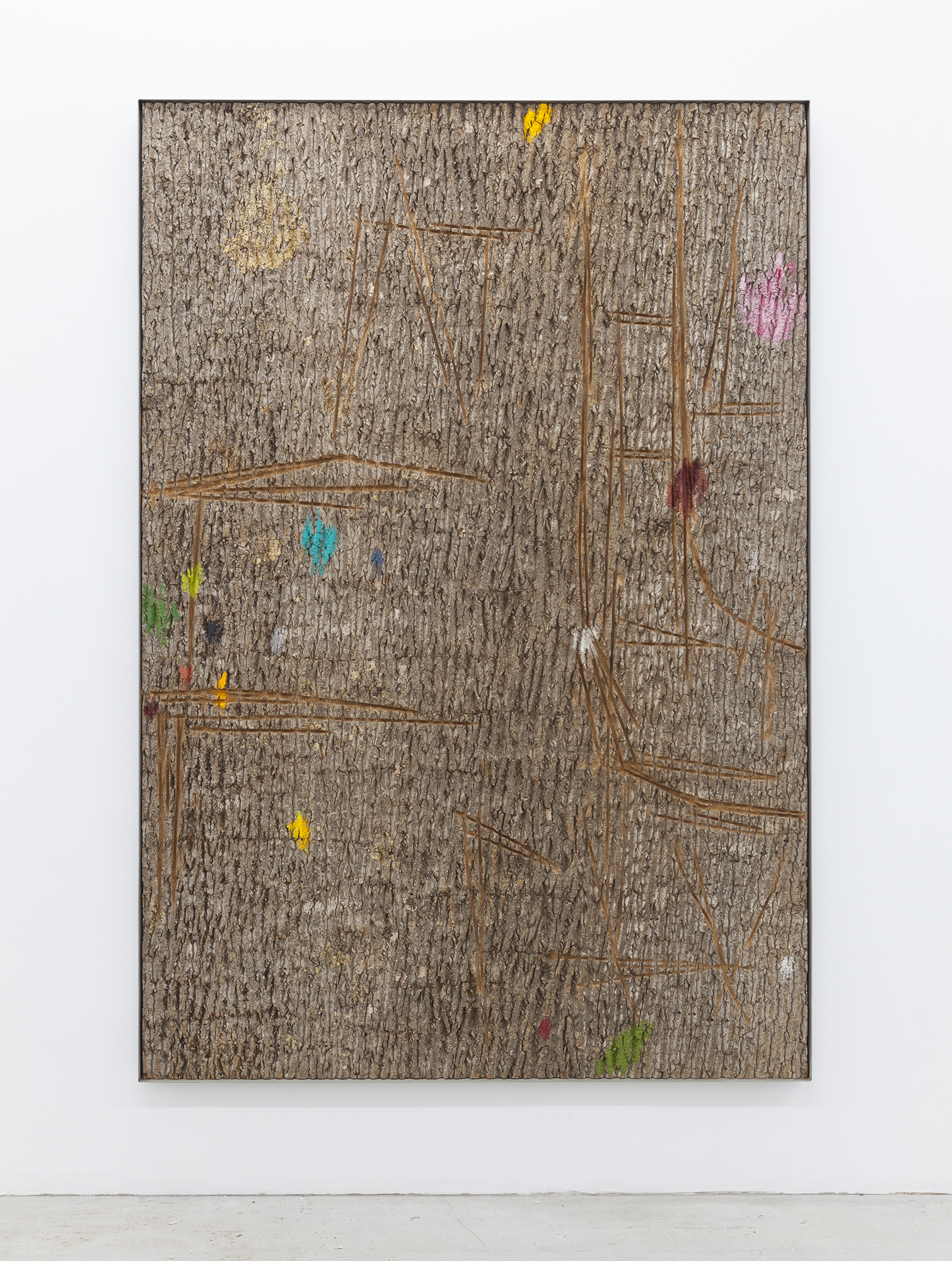 North American Pine, Acrylic paint, chainsaw markings, stainless steel frame